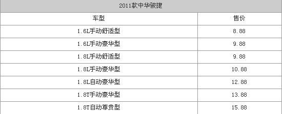 2010年7月8日,華晨中華正式推出了2011款駿捷車型,此次推出的新車共有7款不同配置的車型,分為1.6L、1.8L、1.8T三種動力調(diào)教。據(jù)悉,新車整體的售價(jià)區(qū)間為8.88-15.88萬元。