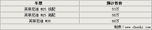 日產的高端品牌英菲尼迪于2007年年底正式在中國地區推出了M35車型,英菲尼迪M35無論從外觀、內飾以及配置上都足以和寶馬5系,奧迪A6等豪華車同臺競爭。相比具有運動風格的英菲尼迪G37,M35是定位于商務用車,從整體的外觀和內飾上比較沉穩和內斂。同時也是英菲尼迪旗下銷售比較好的一款車型。近日我們從英菲尼迪內部人士處獲悉到,全新英菲尼迪M將于10月份引入,全新的英菲尼迪M將搭載3.7L和2.5L兩款引擎,共計3款車型(M37一款;M25兩款),預計售價53-68萬元。