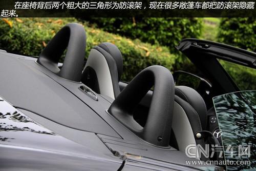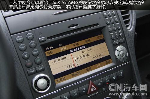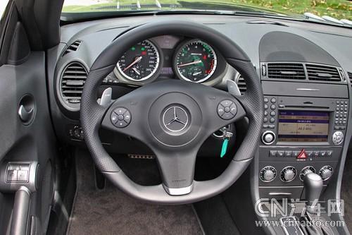 內裝一樣非常有個人風味的SLK55,座椅、內門板、中央扶手均為Nappa高級真皮制成,并且有四種顏色可供選擇,AMG的座椅另外還經過包覆與支撐性的加強,肩部亦可追加Alcantara麂皮,藉以應付激烈操駕的需求。此車的其它不同點尚包括320km/h時速表、跑車方向盤、鋁合金腳踏板、專用地毯、不銹鋼門檻等等,而Thermatic自動空調、室內照明組也列為標準配備。