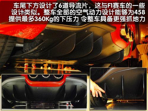 在458Italia的車尾底部,六道導流片在車輛高速行駛的時候為車輛提供充足的下壓力,以及后輪的附著力。在極限狀態下全車的因空氣動力學設計而產生的額外下壓力高達360公斤,這相當于5-7名成年人的體重總和。