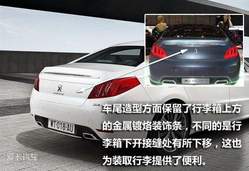 與概念車5 by Peugeot相比,車尾造型方面保留了行李箱上方的金屬鍍烙裝飾條,不同的是行李箱下開接縫處有所下移,這也為裝取行李提供了便利。左右雙開的排氣造型與5 by Peugeot保持一致。另外,原來LED和車體鑲嵌的背對雙C造型有所改變,變為了更易生產安裝的整體組合式設計,不過在燈體內部的點亮部分會繼續保留概念車上的設計元素。