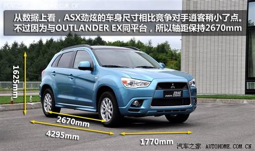 ASX勁炫是自2010年2月開始在日本銷售的豪華緊湊型SUV(RVR)的中國版車型。它繼承了帕杰羅的越野血統,兼備了歐藍德EX都市型SUV的性能。通過緊湊的車身設計、搭載的低油耗發動機、以及鮮明運動風格、加上18至24萬元之間的售價區間,使ASX勁炫在國內同級別市場中有不錯的競爭實力。
