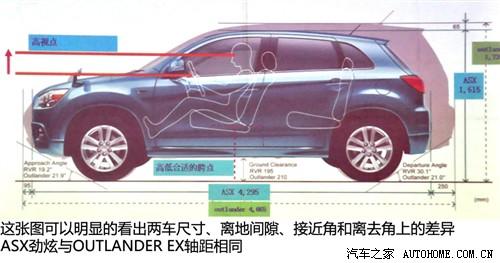 ASX勁炫和OUTLANDER EX同平臺且軸距相同,但在車身尺寸、離地間隙、以及接近角和離去角上都有差異,從下圖中可看出數據上的差別。