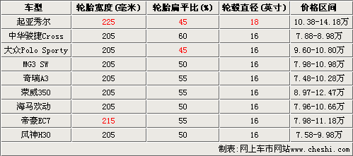 在以上車型之中,帝豪EC7系列全系都配備了215/55R16輪胎,各類尺寸參數(shù)都比較平均,所能影響的性能和舒適度在同級車中比較領先。另外,大眾Polo Sporty與秀爾一樣,是采用45較低扁平比的輪胎,提升了整車的運動氣質(zhì)。大體來看,奇瑞A3、榮威350等偏重家用的車型,輪胎扁平比都偏高,而海馬歡動、MG3 SW等偏向運動的車型,扁平比則略低。
