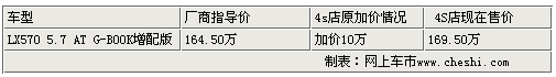編輯從北京地區(qū)雷克薩斯4S店了解到,目前北京地區(qū)緩解了2010年初起因供應(yīng)緊張的加價10萬的局面,現(xiàn)購買雷克薩斯LX系車型出現(xiàn)了較上段時間加價十萬相對優(yōu)惠的僅加價5萬的現(xiàn)車銷售,顏色有黑、白、紅少量可供選擇。如果選擇其他顏色,交車款的30%的定金,最多等待2個月消費者便可提車。如消費者有興趣的話,可以致電經(jīng)銷商處詳詢。由于北京汽車市場變化較快,各店所銷售車輛顏色可能會有所差異。