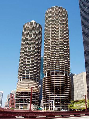 在1964年完工的這兩座雙胞胎塔,被設計成位于市中心廣場的小鎮——是音樂廳、零售商店、溜冰場和保齡球館的復合體。塔自身的結構中包括了車庫:65層的塔樓下邊的三分之一是螺旋上升型的車庫,每層可容納896輛車。該車庫因1979年的故事片《亡命大捕頭》(The Hunter)而聞名,在這部電影里,史蒂夫·麥奎因扮演賞金獵人,在車庫中上演高速汽車追逐戰。在車庫頂部,麥奎因追蹤目標的1980年的龐蒂亞克失去了控制,沖出了車庫,跌入下面的芝加哥河。