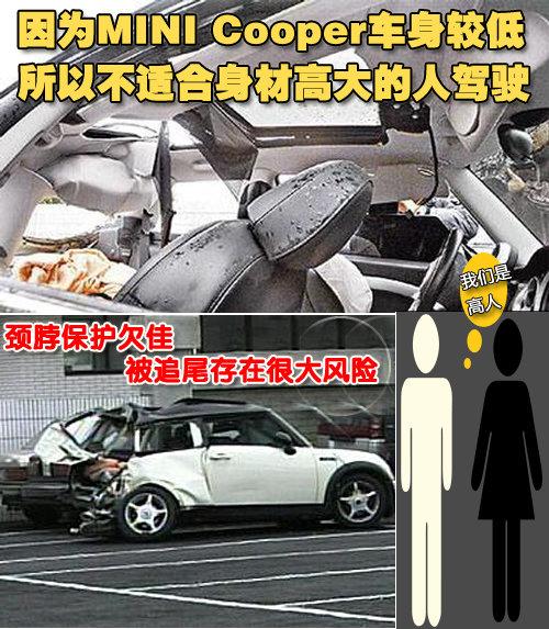 因?yàn)樯聿母叽蟮南M(fèi)者朋友在駕駛時(shí)會(huì)覺(jué)得空間有些局促,這就對(duì)個(gè)人的安全埋下了隱患。特別是并不寬裕的頭頂空間,在不幸發(fā)生了嚴(yán)重的追尾事故時(shí),對(duì)車(chē)上乘員的保護(hù)將十分有限。臺(tái)灣女星許瑋倫就是在自己的MINI Cooper中不幸被貨車(chē)追尾,傷其頸部搶救無(wú)效死亡。