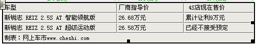 據(jù)北京一汽豐田4S店銷售人員介紹,目前銳志在售的2.5S車型全系可享受到3.5萬(wàn)元的現(xiàn)金優(yōu)惠,銳志 REIZ 2.5S AT特別紀(jì)念和2.5S AT/MT特別導(dǎo)航版現(xiàn)車供應(yīng)充足,且主流的白、黑、紅、銀、蘭5種顏色齊全,另外店內(nèi)推出智能領(lǐng)航版車型,該車與銳志的超級(jí)運(yùn)動(dòng)版(26.58萬(wàn)元)配置完全相同,整車集成了智能導(dǎo)航系統(tǒng)、倒車影像、三屏DVD、遠(yuǎn)程遙控啟動(dòng)系統(tǒng),車載冰箱、智能鑰匙系統(tǒng)、一鍵啟動(dòng)、秘密鍵盤鎖、自動(dòng)升窗、收鏡系統(tǒng)、安全防盜系統(tǒng)、引擎鎖定、智能升窗、震動(dòng)感應(yīng)、開(kāi)門報(bào)警、行車下鎖、藍(lán)牙、運(yùn)動(dòng)擋泥板套裝等豐富配置,新增配置均為原廠配件。增配價(jià)值超出5萬(wàn)元,該車市場(chǎng)指導(dǎo)價(jià)26.68元,現(xiàn)在購(gòu)車優(yōu)惠4萬(wàn)元,該車數(shù)量有限,喜歡銳志的朋友這個(gè)時(shí)候出手最值。其余車型均已停產(chǎn)不接受預(yù)定。銷售人員還表示:在售的這三款車型是豐田銳志賣的最火的也是性價(jià)比最高的三款車型。2011款的銳志9月上市,現(xiàn)開(kāi)始接受預(yù)定,消費(fèi)者交訂金1萬(wàn)便可排號(hào)提車。北京地區(qū)各4S店由于訂單不同,各店銷售的現(xiàn)車顏色有所不同。