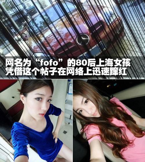 一個網(wǎng)名為“fofo”的80后上海女孩在某知名論壇中發(fā)帖《曬曬我的大奔,你們有嗎?!》,并且貼出了不少靚照,曬自己的奔馳SLK和奢靡生活。就這樣一個帖子,在短短2小時內(nèi)被蓋到100樓,點擊率高達了近10萬,并被很多網(wǎng)友轉(zhuǎn)載到各大論壇,成為最熱點的帖子。