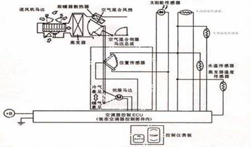 全自動(dòng)溫度控制系統(tǒng)的組成包括溫度傳感器、控制系統(tǒng)ECU、執(zhí)行機(jī)構(gòu)等。其中溫度傳感器有車外氣體溫度傳感器、車內(nèi)氣體溫度傳感器、日照傳感器(陽光強(qiáng)度傳感器)和蒸發(fā)器溫度傳感器。