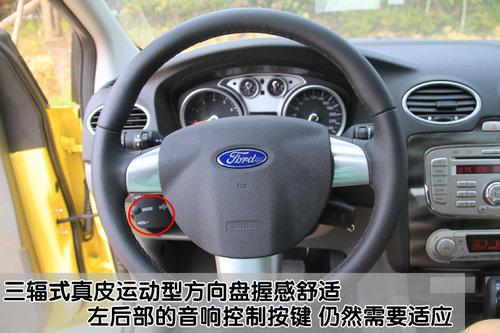 三幅式運動型真皮方向盤握感舒適,大小適中。齒輪齒條式/EHPAS 電子液壓動力輔助轉向系統讓2011款福克斯兩廂運動型擁有較重的手感,這也是運動型轎車的特性,但是女性朋友可能就不會喜歡了。