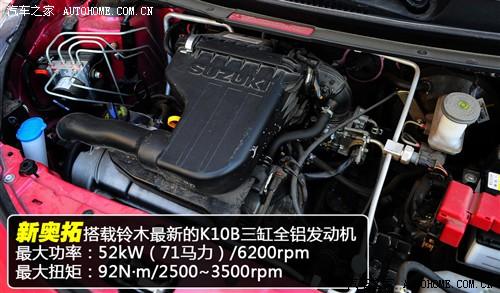 新奧拓搭載了鈴木最新開發的K10B全鋁發動機,最大功率71Ps/6200rpm,最大扭矩92N·m/2500-3500rpm,低轉速區間即可輸出較高的扭矩,發動機調教很適合城市駕駛,發動機采用正時鏈條傳動,終身免更換;另外這款發動機的燃油經濟性非常出色。