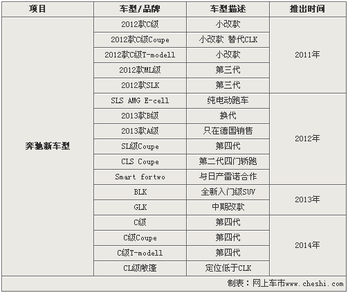 雖然奔馳全新一代CLS轎跑車將在巴黎車展發(fā)布,但是正式上市還要等到明年,而在2012年奔馳全新一代CLS雙門轎跑車也將推出。而已在國內(nèi)投產(chǎn)的奔馳新C級轎車將于明年推出小改款車型,在2014年將陸續(xù)推出全新一代C級轎車以及酷派和旅行版車型。此外,作為奔馳入門級SUV的BLK車型將于2013年正式推出,從進一步抗衡寶馬X1等競爭車型。