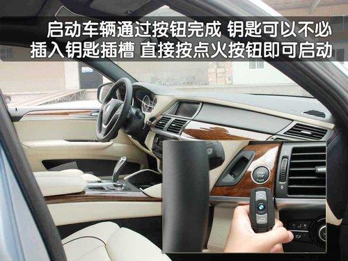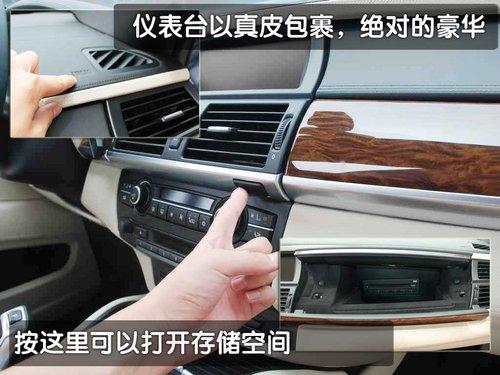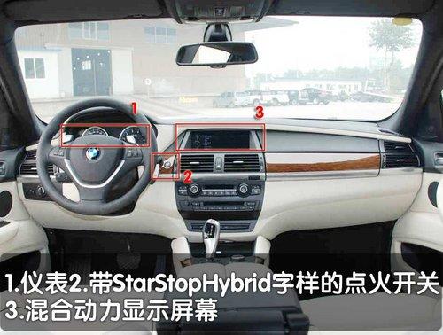 在內飾部分寶馬X6混合動力版車型也有著細微的不同,儀表臺的整體感覺與寶馬家族的其它車型造型統一,略向駕駛員一側偏轉的儀表臺照顧到了駕駛員在駕車當中的操作便捷性。儀表臺整體材料為真皮材質,而鋁金屬裝飾條顯得更加動感十足,但第一感覺始終讓人誤以為是寶馬X5的內飾。