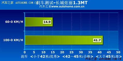 長城汽車的剎車一直得到較高的評價,我們對1.3L車型進行的剎車測試中,車輛全力剎車,車速從100-0KM/h的最短制動距離為41.7米,系統(tǒng)的穩(wěn)定性處于中等水平,剎車成績還是不錯的,我們比較滿意。