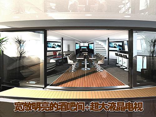 從官方設計圖上我們可以看到起奢華的內部裝飾,液晶顯示屏的操控界面,寬大舒適的駕駛艙座椅,在其船艙還配置了寬敞的酒吧間,木質的地板以及灰色的裝飾增添了雅致的風格。此外還有舒適的長沙發以及小型會議桌等等。