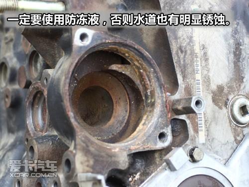 長期使用水而不使用防凍液會腐蝕水泵葉輪,尤其是金屬葉輪腐蝕最為嚴(yán)重。此外,水箱也會被水垢腐蝕造成管路堵塞,圖上這個(gè)腐蝕的情況是一般情況,更為嚴(yán)重的是葉輪已經(jīng)徹底被腐蝕掉,散熱系統(tǒng)降低造成水溫過高而經(jīng)常開鍋。