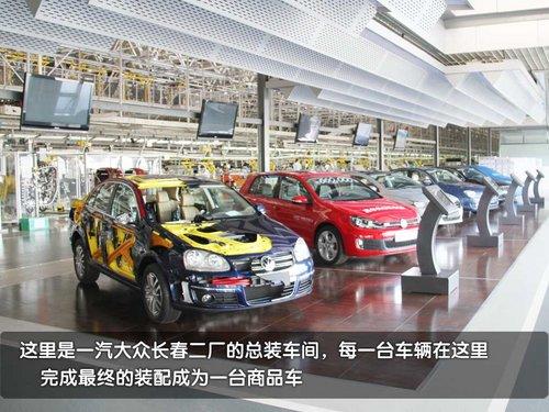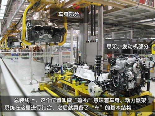 這里是一汽大眾長春第二工廠的總裝車間,車輛門在這里完成“最后的儀式”。在總撞車間的門口可以看到這里生產(chǎn)的每一款車型,打頭的一臺速騰解剖車非常吸引大家的注意(我們隨后會有單獨文章詳細介紹)。從前一工序的噴漆線來到總裝線的準新車都在天上“飛著”。而等到車輛從天上降落到地上之后車輛距離生產(chǎn)完畢就很快了。