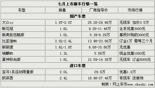 7月份上市的新車型中聚集了眾多知名大品牌。如一汽大眾、鈴木、一汽豐田等。而按照車型細(xì)分,其中涵蓋各個級別的車型,其中自品牌有3款車型上市,分別是比亞迪M6、新駿捷;瑞麟M5;合資車型包括一汽大眾CC、、三菱翼神、新花冠,進(jìn)口車型鈴木凱澤西和寶馬1系運(yùn)動限量版,共計(jì)9款車型。
