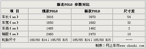 上海大眾即將批量生產的全新第五代POLO在車身尺寸上與國外已經上市銷售的車型一致,而與2006年推出的小改款車型POLO勁情大了一小圈。第五代Polo來自大眾的PQ25平臺,長比第四代車型長了5.4厘米,寬度增加了3.2厘米,軸距加長了1厘米,高度僅增加了0.3毫米,在高度上幾乎沒有變化。