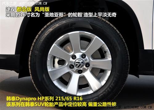 途觀的都會版和風尚版分別是低配和中配車型,兩者采用了名為“圣地亞哥”的16寸輪轂,造型上平淡無奇,搭配了215/65 R16的輪胎,品牌為韓泰Dynapro HP系列,在全系韓泰SUV輪胎產品中,該系列定位是“豪華SUV的高性能輪胎”,盡管官方的描述難免有些夸張,但不難看出它強調的是操控性能,這也與途觀的定位非常吻合,但是215mm的寬度對于SUV來說有些偏窄。
