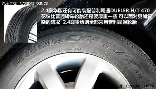 據本田廠家工作人員介紹,CR-V的2.4升豪華版會根據車輛生產的批次不同搭載不同的輪胎,除了上面介紹的鄧祿普GRANDTREK ST30系列之外,還可能裝配普利司通DUELER H/T 470輪胎,這款輪胎也是一款結合了公路和野外行駛能力的混合型輪胎,而在導航版車型上則全部使用的該產品。據了解,米其林輪胎已經在2010款車型上停止使用了。