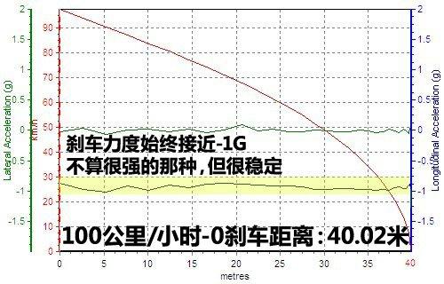 加速性能沒有能讓我們體驗到激情,但剎車能力絕對令人稱贊!平均剎車成績40.02米,而且幾次剎車都完全沒有出現熱衰減的現象,懸掛對于車身前傾的控制也非常理想。