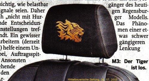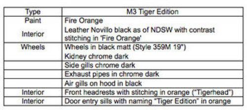 外觀方面,M3 Tiger特別版的進氣格柵、反光鏡邊緣都使用了黑色,而車輪部分也升級為寶馬的359M系列(16輻)運動化鍛造黑色19英寸輪轂,配合銀色的鍍鉻排氣管。內飾部分,M3 Tiger紀念版的內飾為黑色真皮坐椅,對應火焰橙的走線。