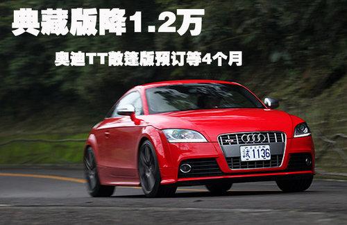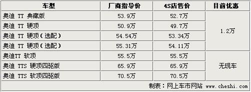 據(jù)4S店銷售人員介紹:目前奧迪TT已上市的典藏版車型店 內(nèi)有現(xiàn)車,售價為53.9萬元,TT標準版車型有現(xiàn)車,售50.9萬元,但還有2款在50.9萬元基本款車型上增配車型,分別售54.54萬及55.31 萬,以上這4款車型都可優(yōu)惠1.2萬元,車身顏色共有白色、紅色、銀色及日光橙色供挑選。奧迪TT典藏版相對在售TT車型不同的是,這款車配以橘色車身及 運動套件,車內(nèi)車外都進行運動改裝,看起來十分漂亮。如需預(yù)定TT及TTS其他顏色及車款,需等待4-6個月時間,由于是按照車主需求定制車型,所以等待時間較長。