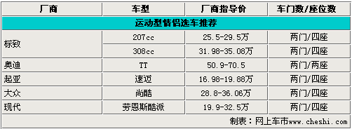 雙門跑車歷來是“小資”消費者們的首選,時尚的外觀和出色的動力性能足以讓您身邊喜歡運動、追求速度感的美女感到興奮。下面網(wǎng)上車市為您選取了308cc、奧迪TT、速邁、尚酷、勞恩斯酷派等熱銷雙門跑車。