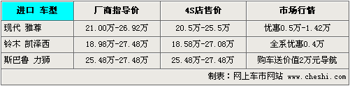 在20—30萬的價格區間內,可以說進口中級車的可選擇性并不是很多,目前銷量較為突出的則是斯巴魯的力獅車型,目前購買可獲贈車載導航,而新推出不久的鈴木凱澤西在配置上相當完備,近期購買可獲得4千元的優惠,進口現代雅尊則是少數人的偏愛,但在優惠幅度上最高,優惠后最低僅售20.5萬元。