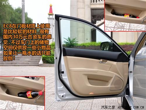 上面我們說了,帝豪EC8在內飾上使用的材質上均為軟質材料,摸起來很有手感,材質的質地與做工與國內20-30萬元的車型很有一拼。不過在一些小細節上,EC8還需進行一些處理,如車門上的儲物槽!