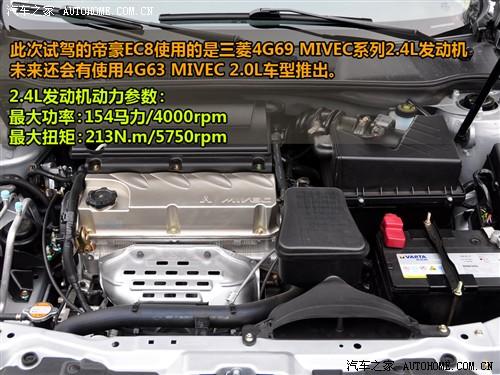 此次試駕的帝豪EC8車(chē)型全稱為EC825,采用的是三菱2.4L 4G69發(fā)動(dòng)機(jī),這臺(tái)發(fā)動(dòng)機(jī)可是有歷史念頭了,國(guó)內(nèi)很多廠家都在使用這臺(tái)發(fā)動(dòng)機(jī)作為自己的動(dòng)力單元。而帝豪EC8使用的這臺(tái)發(fā)動(dòng)機(jī)則是原裝進(jìn)口的4G69 MIVEC發(fā)動(dòng)機(jī),雖然從數(shù)據(jù)上看并么有什么亮點(diǎn),但是發(fā)動(dòng)機(jī)本身質(zhì)量比較過(guò)硬,同時(shí)在油耗方面比較控制的相對(duì)較好。
