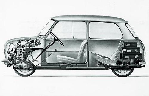 由于1956年爆發(fā)的蘇伊士運河危機使得英國的汽油供應(yīng)緊張,迫使政府對石油采用配給制。顯然,這使得當(dāng)時那些高油耗的大型車銷量急劇下降,而所謂的泡沫車(bubble cars)的市場正在蓬勃發(fā)展。BMC公司意識到這一機遇,決定生產(chǎn)一種比較經(jīng)濟省油的小型汽車。1957年3月,當(dāng)時的BMC公司總裁吩咐擅長設(shè)計小型車的亞歷克·伊斯哥尼斯停止手頭所有的工程,開始新車的設(shè)計。亞歷克的設(shè)計出發(fā)點非常明確:車身尺寸最小化、乘客行李空間最大化。他和他的一個設(shè)計師小團隊一起最終在1957年10月制造出了原型車。新車使用了傳統(tǒng)的BMC的4缸水冷式發(fā)動機,但卻創(chuàng)新地將其橫置,并采用了四速變速箱和前輪驅(qū)動。