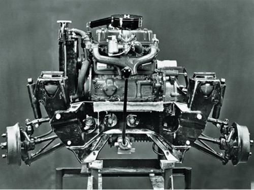 其創(chuàng)新就是將散熱器安置在了車的左側(cè),從而在狹小的發(fā)動機艙內(nèi)能夠?qū)⑸犸L(fēng)扇保留。這種設(shè)計大大節(jié)省了車身長度,但這樣做面臨的缺點就是吹向散熱器的空氣是已經(jīng)在流經(jīng)發(fā)動機時被加熱過了。