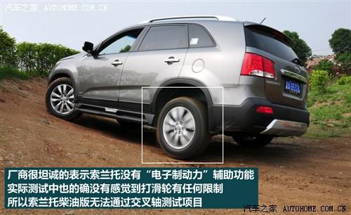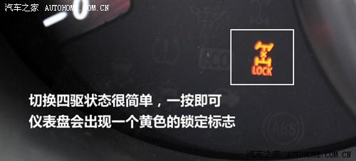 按動(dòng)中控臺(tái)上的四驅(qū)按鍵即可切換至四驅(qū)模式,索蘭托采用中央多片離合器的四驅(qū)結(jié)構(gòu),前后橋差速器均不帶有鎖止功能,并且沒有電子制動(dòng)輔助,因此想通過交叉軸是不可能的,所以在進(jìn)行淺度越野時(shí)應(yīng)該優(yōu)化路線避免出現(xiàn)交叉軸的情況。