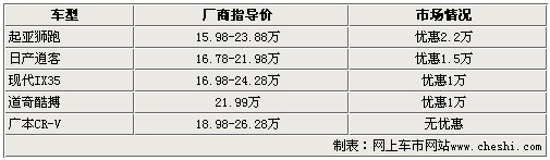 五款車型除了價(jià)格一直堅(jiān)挺的CR-V以外,都有一定程度的價(jià)格優(yōu)惠,而且全部過(guò)萬(wàn)。這樣的營(yíng)銷手段,對(duì)于本就十分火爆的SUV市場(chǎng)定會(huì)造成不小沖擊。從1萬(wàn)到2.2萬(wàn)的價(jià)格優(yōu)惠,對(duì)于熱銷SUV來(lái)說(shuō)還算厚道,特別是剛剛上市不久的現(xiàn)代IX35,僅上市幾個(gè)月就出現(xiàn)了1萬(wàn)元的價(jià)格優(yōu)惠,實(shí)屬不易。