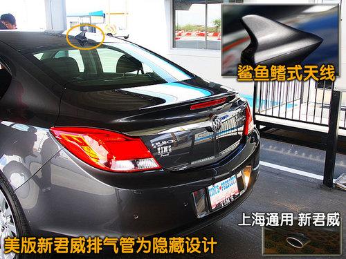 北美版新君威配備了信號較強的鯊魚式的天線,這樣的配置一般在豪華車中才可以看到。同時北美版新君威尾排采用了隱藏式設計與國內版本的外露式不同。