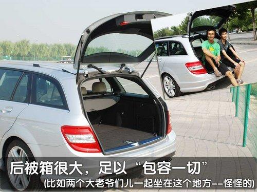 很多人會指著這款奔馳C級旅行車說:看,這不就是加了一個大尾巴嗎?大家的看法我想是不無道理的。不過至少從外型上來說,C級旅行車與普通C級轎車除了正面上看幾乎無法分辨之外其它的每一個角度C級旅行車都會顯得那么與眾不同。從B柱開始至車尾,奔馳C級旅行車的側面線條由于外形的設計被拉伸的非常明顯。車頂的兩條鋁合金行李架對于C級旅行車來說顯得尤為重要,而如果車主選了了官方提供的套件,那么除了在車頂或是車尾加裝自行車架之外,托掛上一臺小拖車也是沒有問題的。自行車、行李箱又或是滑雪板、沖浪板,任憑您能夠想到的東西不妨都嘗試著舉到車頂上面——這真的是一種有趣的嘗試。