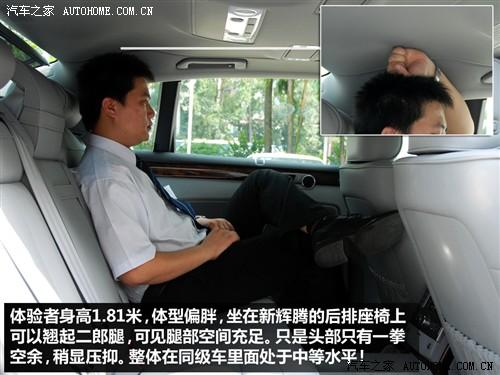 如果你是輝騰的車主那么一定更愿意坐在后排,那么乘坐空間肯定是第一位的,身高181cm的體驗(yàn)者坐在后排腿部的縱向很充裕,但是受到車頂造型的影響頭部空間沒(méi)有想象的大有一拳左右,不過(guò)這樣的空間表現(xiàn)如果乘客不是過(guò)于挑剔應(yīng)該可會(huì)滿意。
