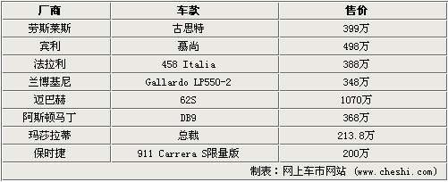 這次成都車展勞斯萊斯、賓利、法拉利、蘭博基尼等高端品牌悉數(shù)參展,為成都的消費者帶來了其當(dāng)家車款,比如古思特、慕尚、458 Italia、Gallardo LP550-2都是上市不久的新車,邁巴赫在車展上首發(fā)了其全新一代62S,預(yù)計售價1070萬元,而保時捷也發(fā)布了911 Carrera S Porsche Carrera Cup Asia,限量發(fā)售30臺預(yù)售200萬。