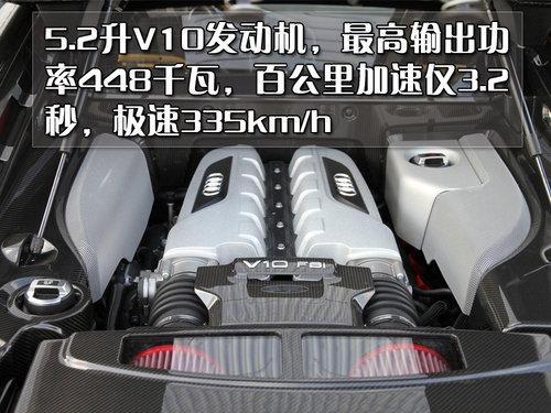 動力方面,改裝版R8搭載一臺原廠V10發動機,最高輸出功率在7400轉時達到448千瓦,峰值扭矩則為565牛米。輸出功率比普通版提升了62千瓦,主要是改進了發動機,增加了新的發動機進氣系統和運動空氣濾清器。同時輕量化的車身使其比普通版輕了250千克,百公里加速僅為3.2秒,極速可達335km/h。