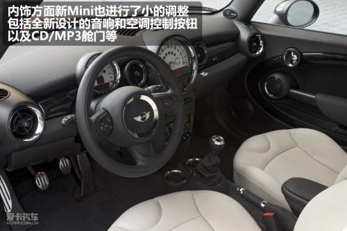 內(nèi)飾方面新MINI也進(jìn)行了小的調(diào)整,其中包括全新設(shè)計(jì)的音響和空調(diào)系統(tǒng)控制按鈕、以及CD/MP3艙門等。配置方面將增加升級(jí)版收音機(jī)、MP3/CD播放器、AUX接口微型導(dǎo)航儀、彩色行車電腦顯示器、藍(lán)牙和USB音頻接口等。