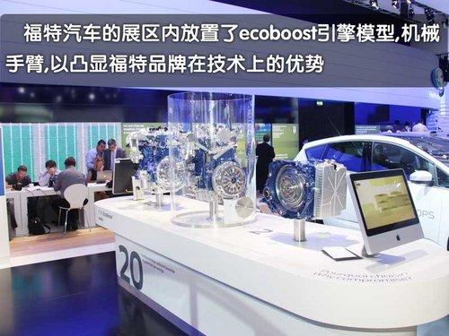 福特汽車在這次巴黎車展現場從面積上來說還是不小的,但是在展區內的設計以及各個展示區域的布局上與國內近兩次大型國際車展的布局和功能沒有區別。由于福特正在積極宣傳他們的ECOboost增壓加直噴引擎,所以福特展區內引擎占據了重要的位置。