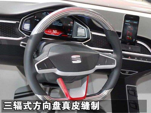 西亞特IBE概念車采用的三輻式運動型方向盤設(shè)計,灰色格調(diào)下配有紅色點綴,很有性能車的感受,材質(zhì)上采用真皮縫制手感會非常不錯。