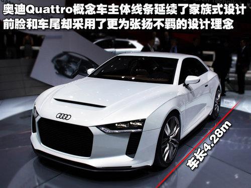 奧迪Quattro概念車在巴黎車展首發,作為奧迪展臺上一款備受矚目的車型,奧迪Quattro概念車集奧迪家族各種傳統元素于一身,并且在某些設計環節上還做出了不小的創新。奧迪Quattro概念車的誕生是為了紀念奧迪Quattro技術研發成功30周年,這款十分獨特的掀背轎跑車有望量產,不過時間暫時尚不確定。