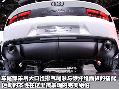 車尾部奧迪Quattro概念車除了車漆意外,基本全部被碳纖維包裹,甚至武裝到了排氣尾喉上,全碳纖維后保險杠的風格讓車輛的運動感瞬間提升了一個檔次。