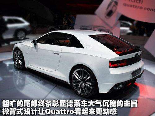 由于采用了掀背式設計,奧迪Quattro概念車尾部線條十分緊湊。與車頭的線條設計完全不同,渾厚敦實的的造型給人很強烈的安全感。
