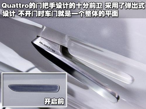 奧迪Quattro概念車的車門把手設計是全車另一大亮點,在沒有使用的情況下,它會隱藏在車門內部,讓整個車門看起來是一個整體,沒有一點突出。當需要開門的時候,只需按一下靠前的位置,車門把手會彈出,上車之后把手會自己閉合到起始位置。