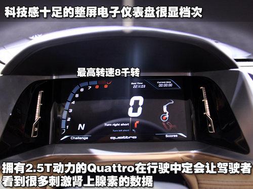科技感十足的整屏式電子儀表盤是奧迪Quattro概念車的另一大創(chuàng)新,8000轉(zhuǎn)的最高轉(zhuǎn)速向人們顯示了他的實(shí)力。除了車輛信息,顯示屏也同樣會(huì)顯示導(dǎo)航等信息,這也就是為什么中控臺(tái)如此簡(jiǎn)潔的原因。